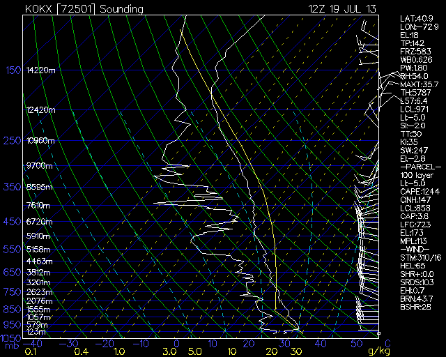 On the morning of July 19, the KOKX sounding revealed a relatively shallow unstable layer extending from 950 mb to 750 mb with a strong surface based inversion and little to no wind shear.