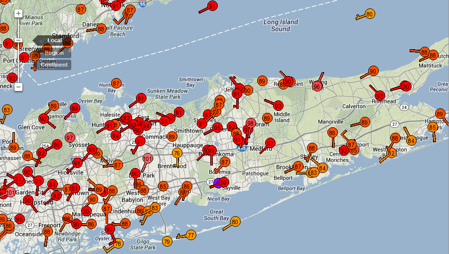 As a result of this ridging, 500 mb heights climbed to near 5910 gpm with 850 mb temperatures topping a toasty 20 degrees celsius at KOKX at 12Z on July 19, 2013. Given mostly clear to partly cloudy skies associated with subsidence aloft, surface temperatures climbed into the low to mid 90’s. In addition to the oppressive heat, a subtropical air mass was situated over the entire northeast U.S. allowing dewpoints to reach into the mid 70’s.